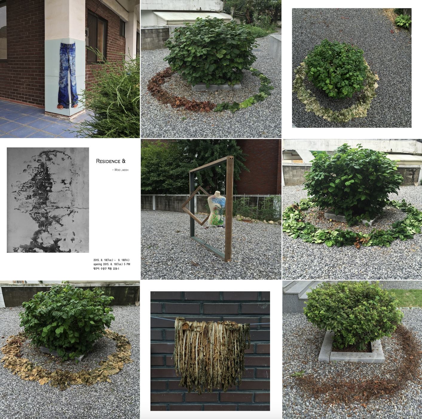 "아래 이미지의 설치작업들은 2010년부터 현재까지 이어지는 작업들을 찍은 사진입니다. 좌측 상단부터 보시면 되고 우측 하단에 보이는 작품이 2013년의 작품입니다. 이후로는 제가 사는 곳 마당에서 다시 자연으로 돌아가는 과정을 겪고 있습니다. 이 작업은 타이틀처럼 나를 위한 위로입니다. 이야기하고자 하는 것은 인간과 자연의 관계, 개발과 발전이라는 바퀴 아래 밀려나고 사라지는 것들에 대한 제 연결점들에 대한 위로입니다."