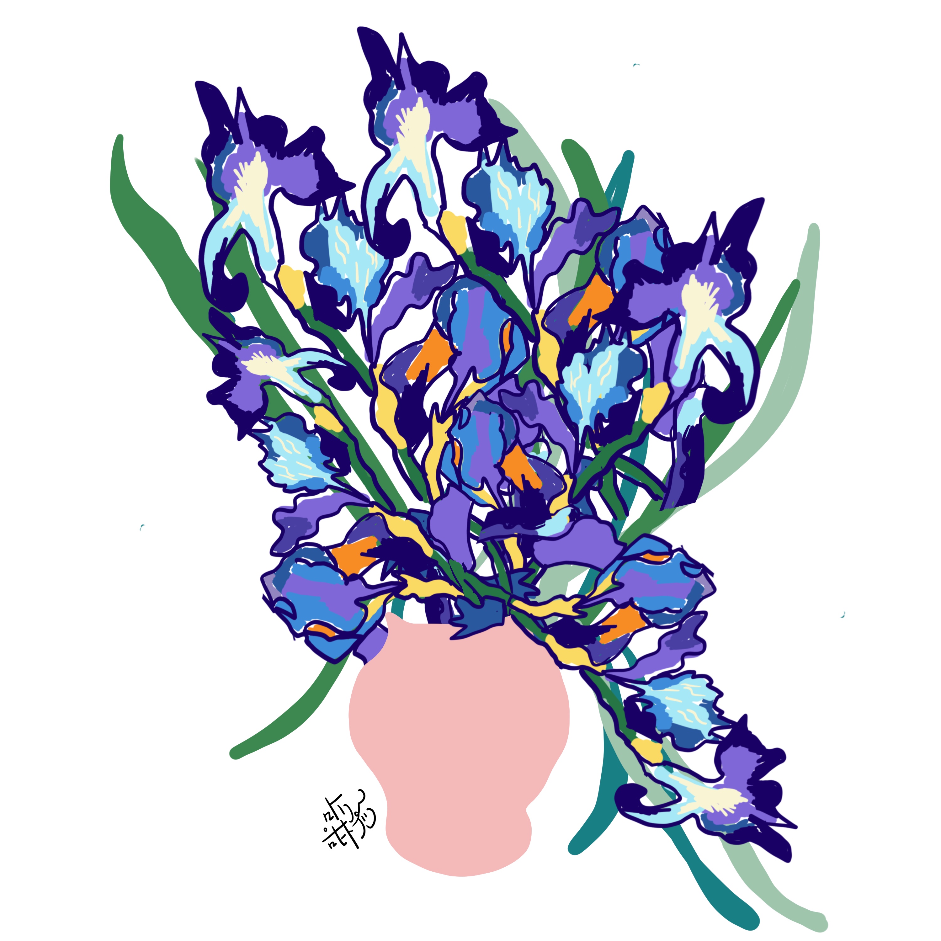 고흐는 병원에 입원해있으면서 자신의 방을 그리워 하며 아들의 침실 그림을 그렸다고 해요. 다음은 '생각이 걸려 있는 방'이라는 제목의 오마쥬 작품입니다. 그가 좋아하는 해바라기와 따뜻한 색감으로 그의 방을 꾸미고 벽에는 저의 그림이 걸려 있습니다. 고흐가 좋아하는 해바라기와 아이리스를 저의 색감으로 생명력을 가득 담아 고흐를 위해 그렸습니다."