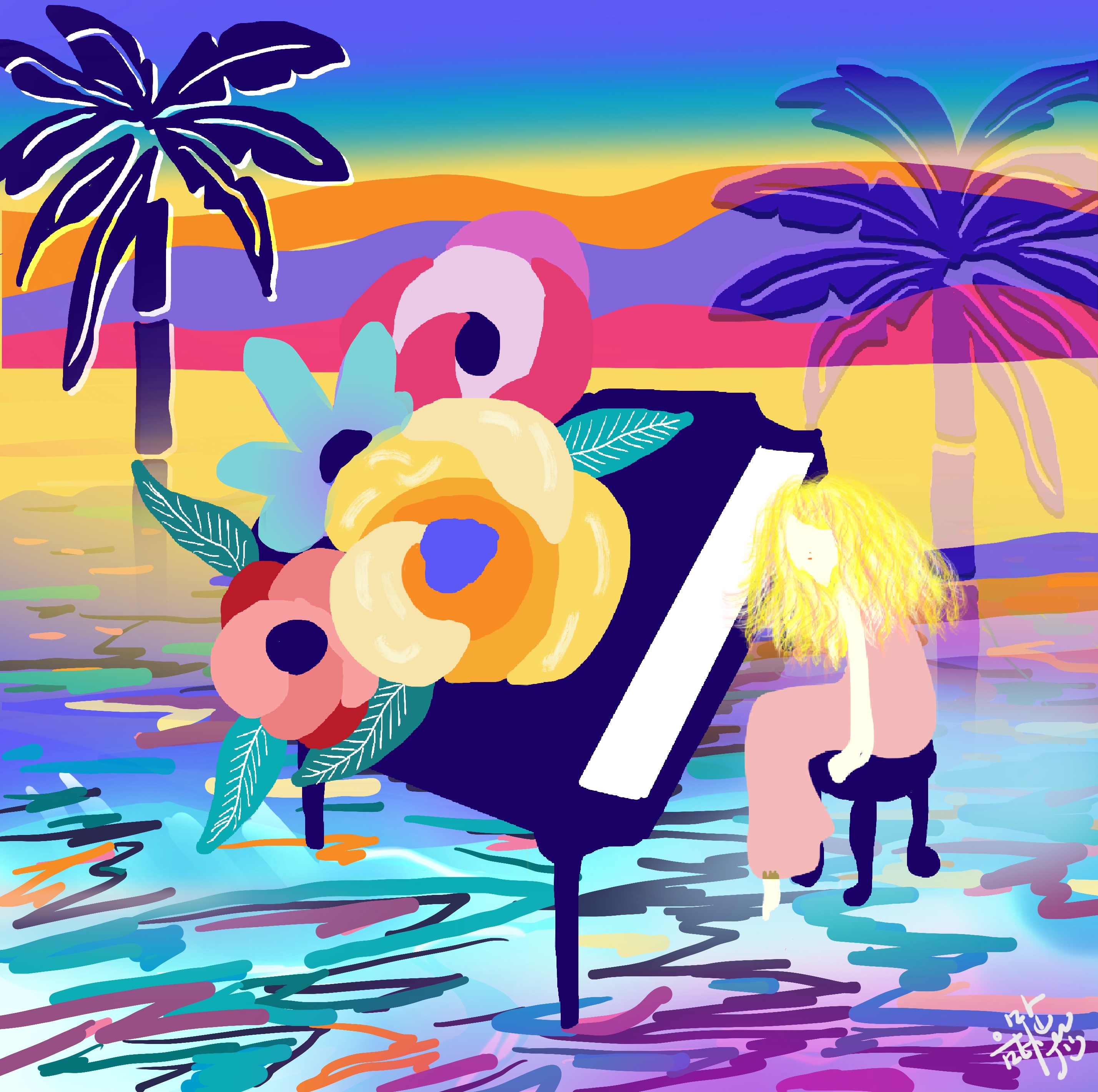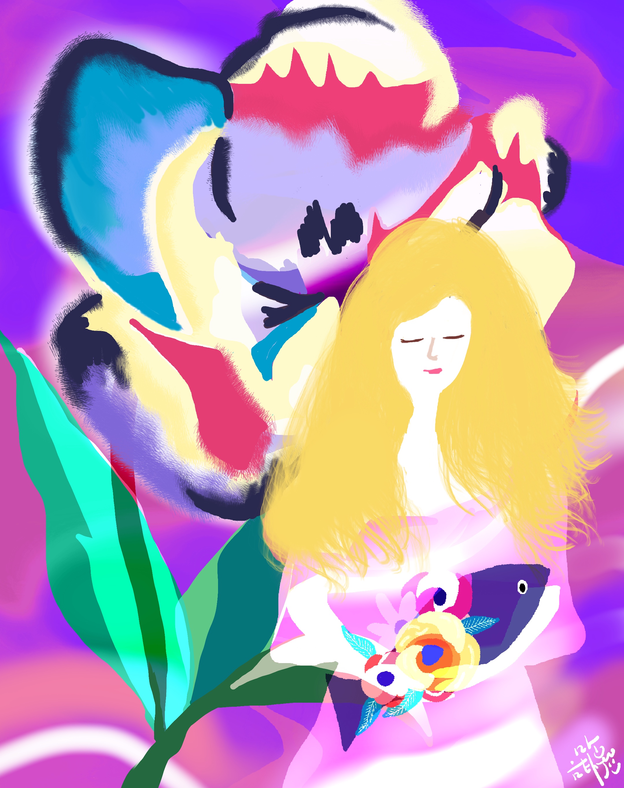 '난 나를 사랑해' 라는 작품입니다. 꽃에 애정을 쏟고 물을 주듯 나를 사랑하고 아껴주는 메세지를 담았습니다. 가장 예쁜 생각을 너에게 주고 싶다는 바램을 담아 그린 그림입니다. 그림을 그린다는 것은 저에게 오랫동안 내 안에 단단하게 굳어져 있는 무언가를 녹이는 과정이였습니다. 내가 미처 알지 못했던 어두운 그늘일 수도 있고 트라우마일 수도 있습니다. 진정한 나와 대면하는 용기가 필요한 일이기도 했어요. 오른쪽은 예쁘고 아름다운 모습으로 살아가는, 사람들에게 보여지는 사회적 자아 패르소나입니다. 왼쪽은 평소 인식하지 못한체 살아가게 되지만 나의 내면 깊숙한 어둠 속에서 존재하는, 빛나고 있는 '진정한 나'입니다. 트라우마일 수도 있고, 어두운 그늘일 수도 있지만 그것조차도 매력적인 그림자라는 생각이 들어요. 그림을 그리며 살아간다는 것은 미처 알지 못했던 새로운 나를 알아가는 과정이라는 생각이 들었어요. 사회화된 페르소나와 내면 깊숙한 곳에 자리 잡은 무의식이 만나 밝고 예쁜 꽃이 피어납니다."