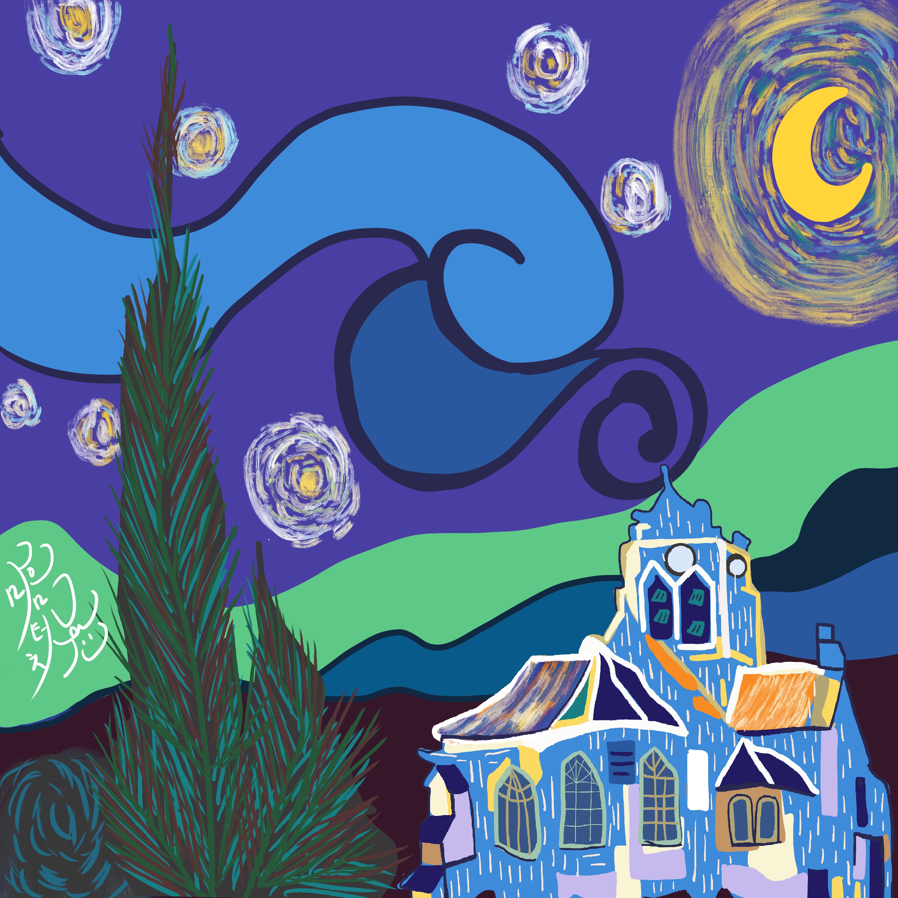 스누피가 슬픈 얼굴로 갑자기 난 화재에 자신의 집이 모두 불타 버렸다며 슬퍼하는 에피소드가 있습니다. 집 안에 들어 있던 좋아하던 빈센트 반고흐 페인팅도 모두 불타버렸다면서 슬퍼합니다. 스누피에게 새로운 집을 선물 했어요. 딱딱한 지붕 대신 평평한 모양의 지붕을 갖고 있는 새집, 그리고 따뜻하게 누울 수 있는 잔디 이불도 깔아주었습니다. 잔디 이불은 그날의 햇빛, 달빛, 별빛에 따라 색이 변하는 인공지능 야광 이불입니다. 빈센트 반고흐 페인팅도 함께 불타버렸다며 슬퍼하는 스누피에게 제가 그린 반고흐 오마쥬 작품을 집들이 선물로 보냈습니다. 선물을 받고 그날 스누피는 환상적인 꿈을 꾸었다고 합니다. 저의 세상으로 놀러온 스누피 이야기는 다음 편에 계속됩니다. To be continued..."