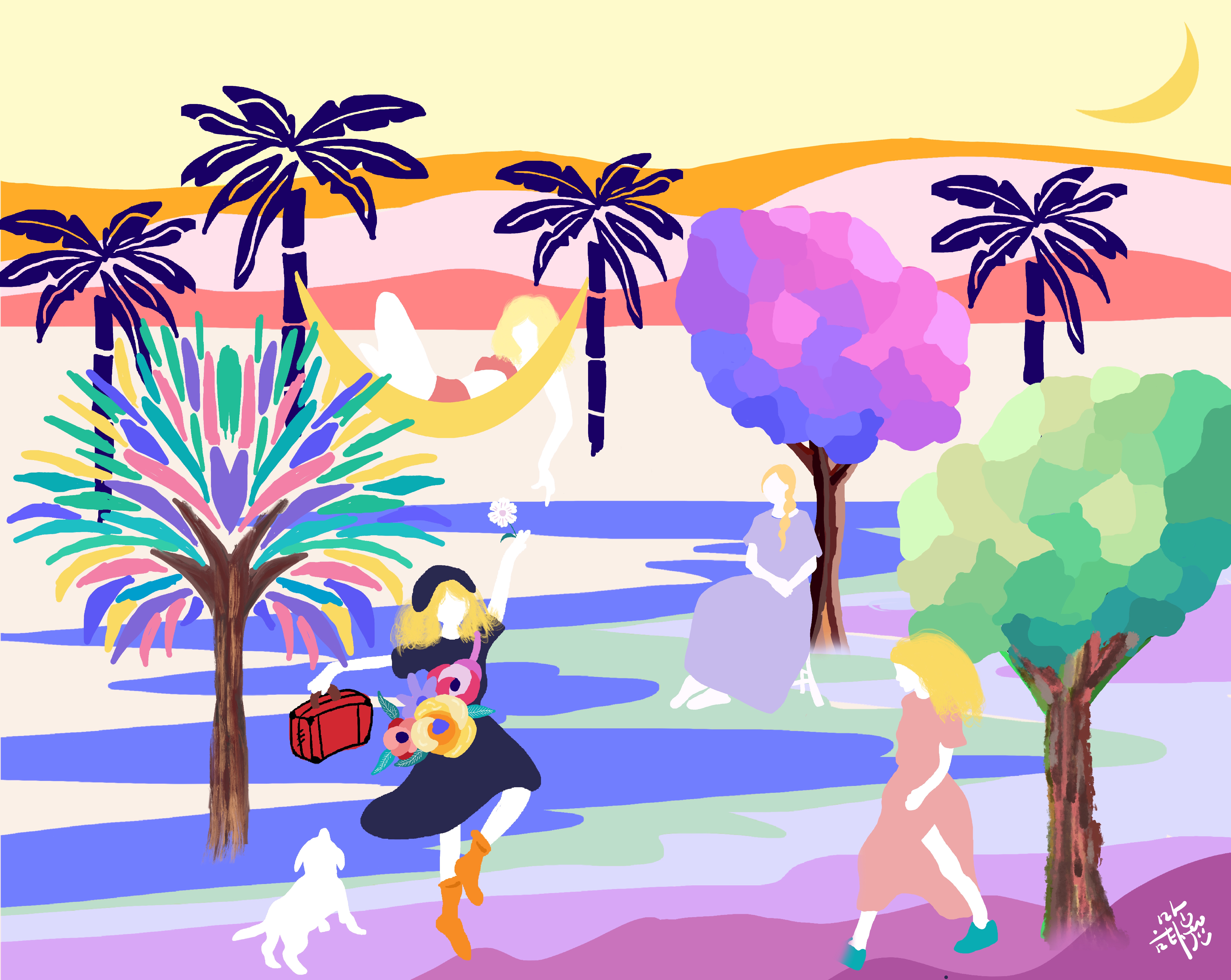 '나만의 케렌시아'라는 작품으로 케렌시아는 스페인어로 '안식처'라는 뜻을 갖고 있습니다. 투우장에서 격렬하게 싸우던 소가 잠시 휴식을 취하는 장소를 케렌시아라고 합니다. 케렌시아의 안전한 장소에서 소가 충분히 휴식을 취하듯 바쁘게 살아가는 우리도 아무에게도 방해받지 않고 휴식을 취할 수 있는 나만의 시공간은 꼭 필요하다는 생각을 담은 작품들을 많이 그리고 있습니다. 나만의 시공간을 갖는다는 것이 꼭 멀리 여행을 가거나 시간과 돈이 필요한 것은 아닌것 같아요. 집에서 강아지와 보내는 시간, 책을 읽는 시간 모두 행복한 몰입을 통해 에너지를 충전할 수 있는 소중한 시간들입니다. 위로의 메세지와 나를 사랑하는 메세지를 담은 그림을 많이 그리고 있습니다.