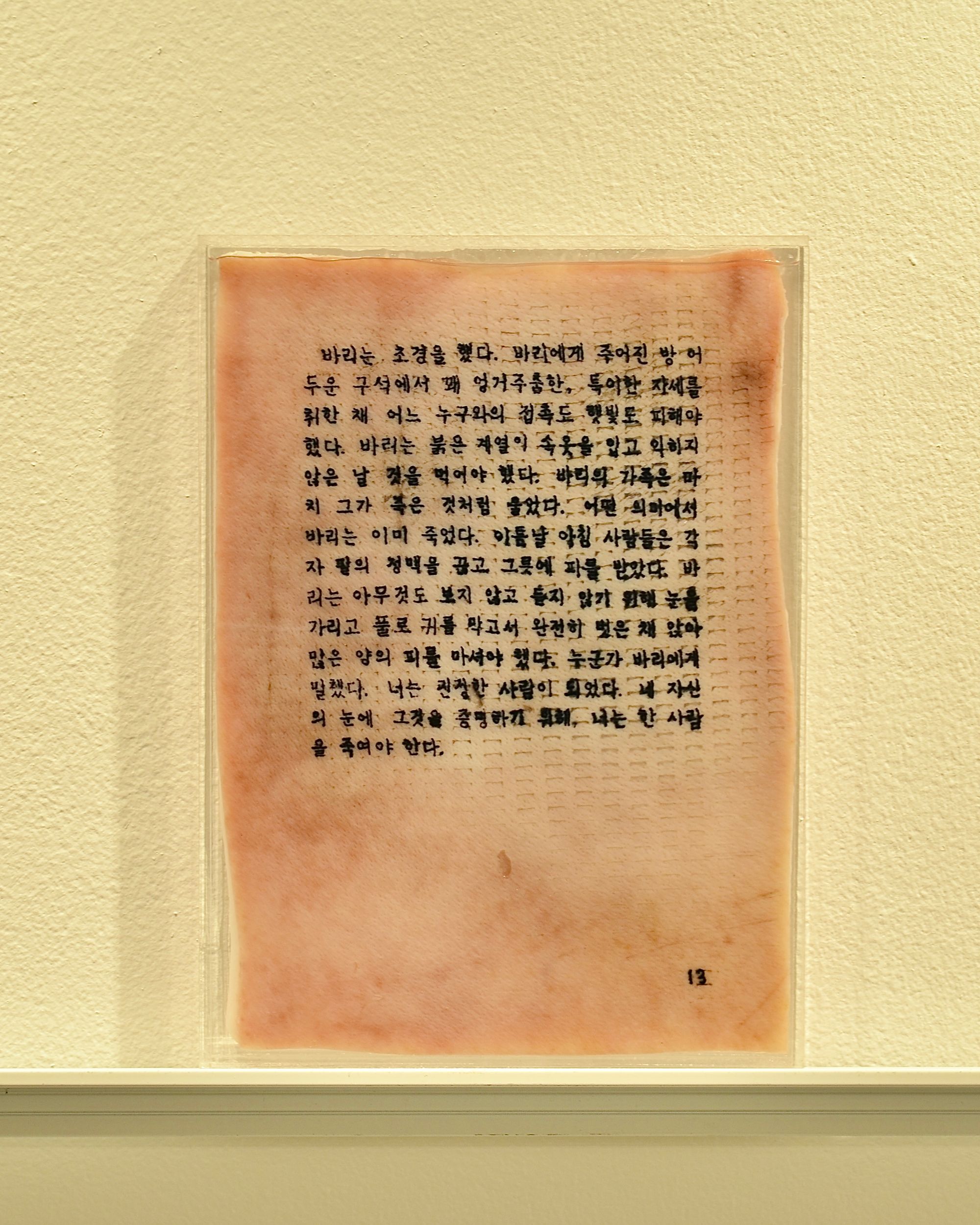 바리 일대기는 수많은 신화에서 따온 이야기들, 주변에서 들은 이야기들, 그리고 저의 이야기들을 조각조각 섞어서 만들어 내죠. 그리고 돼지 껍데기를 책 사이즈로 재단해 바리 일대기를 문신으로 새기는 작업을 했습니다. 바리는 결국 신적인 존재가 되어 사람들을 위로(치유)해 주는 존재가 되는 것으로 마무리 돼요.