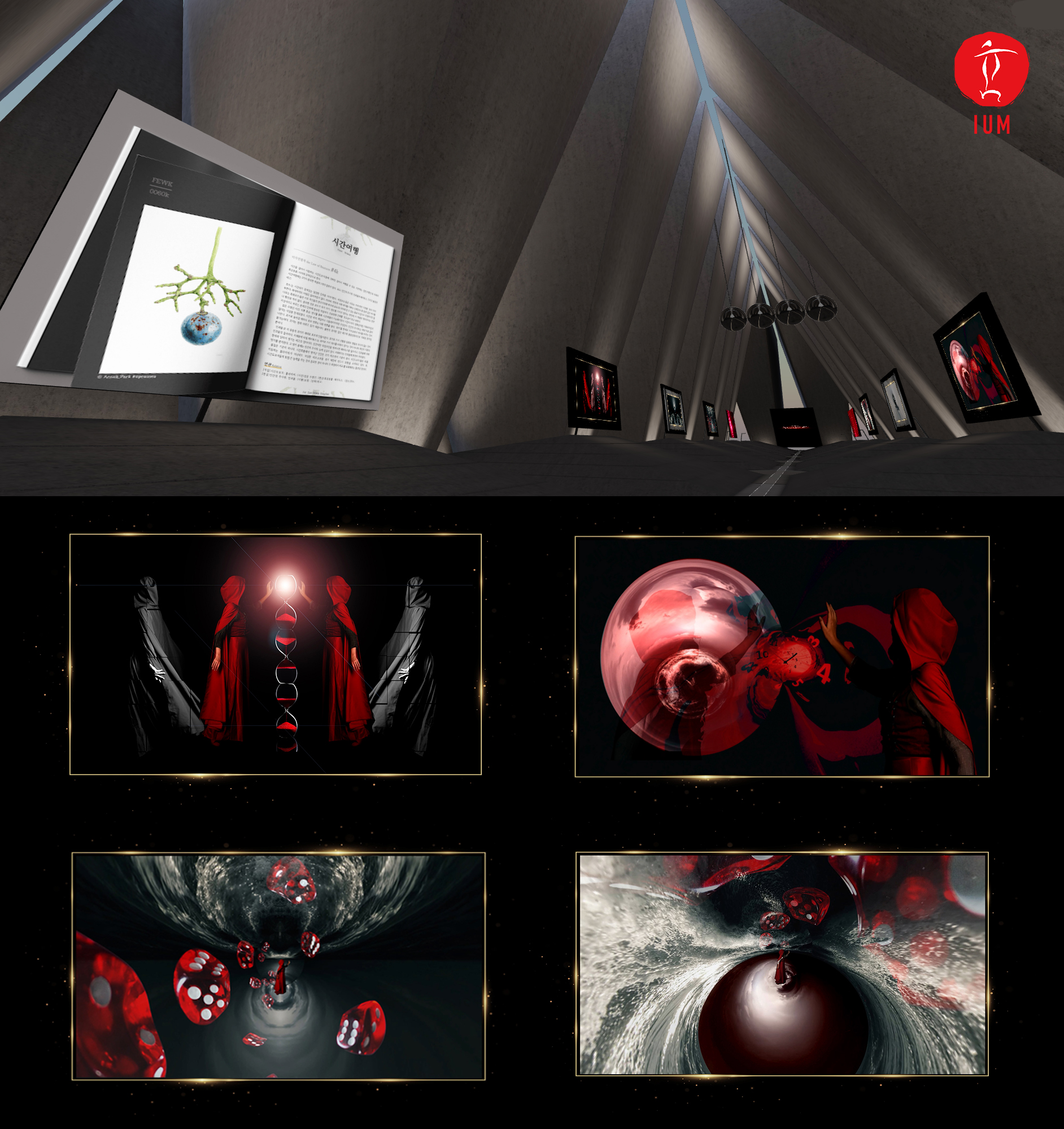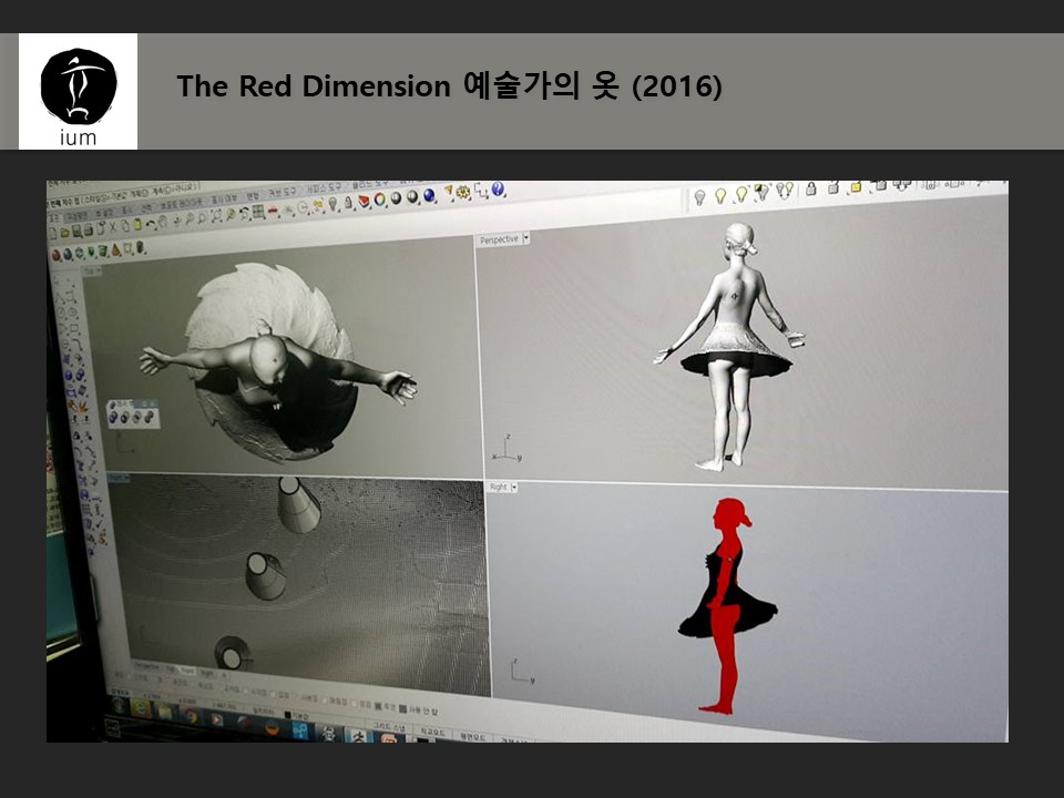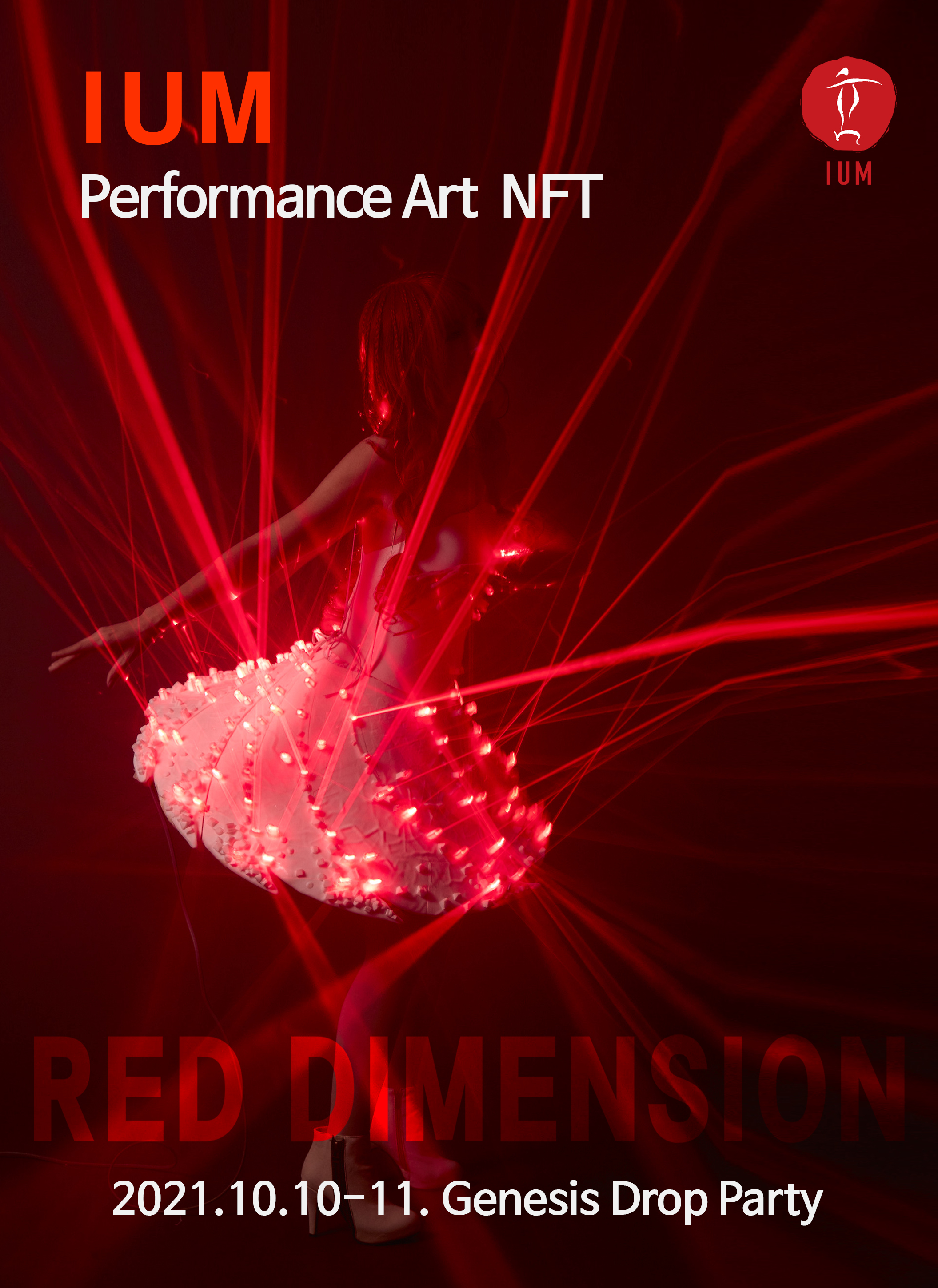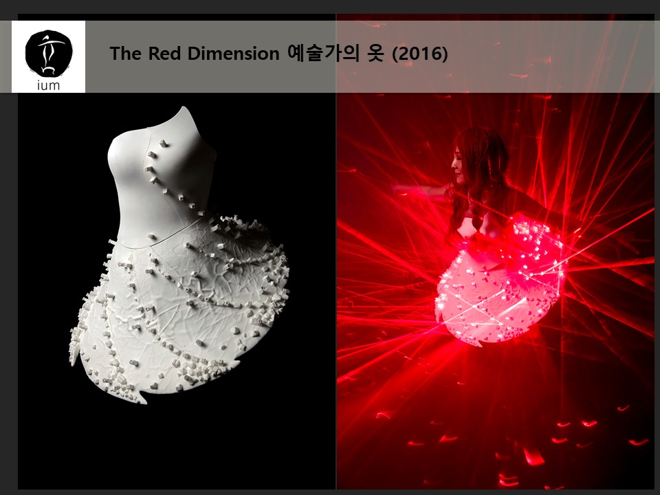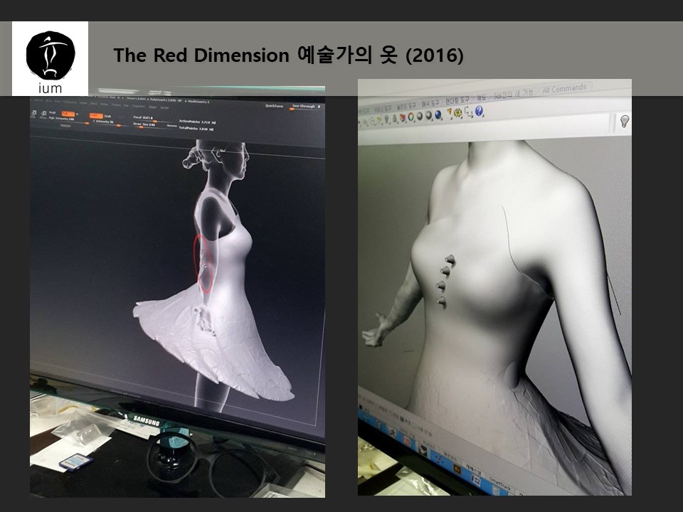 레드디멘션의 저의 NFT 작품인 'Artist Dress in Metaverse'를 근간으로 설명해드리고자 합니다. 이 작품은 레드디멘션이라는 예술적 세계관을 바탕으로 메타버스 세계에서의 아티스트 이윰의 정체성이 담긴 의상조각을 애니메이션 기법으로 빠르게 회전하며 다양한 각도의 형태를 보여주고 있습니다. IUM의 신체를 3D 스캐닝하여 디지털 휴먼의 신체를 형성하고 그 신체에 맞춤형인 드레스를 3D 모델링으로 디자인한 후 최종적으로 이 디지털 의상 조각은 3D 프린팅을 통해 실제의 조각품으로 완성되었습니다. 디지털 휴먼으로서의 이윰도, 실제 인물로서의 이윰도 이 의상조각을 착용함으로써 가상과 현실을 오고 가는 메타버스 예술가의 정체성을 가지게 된 것입니다. 그러한 메타버스적 정체성이 데이터화된 이 애니메니션 작품에는 IUM의 디멘션 파인딩에 대한 상상력의 이론이 담겨 있습니다. 의상 자체가 상상 속의 레드디멘션으로 향하는 통로와도 같이 고안되어 있으며 그것은 의상 형태의 다양한 각도에서 그 상징 의미를 찾을 수 있습니다.