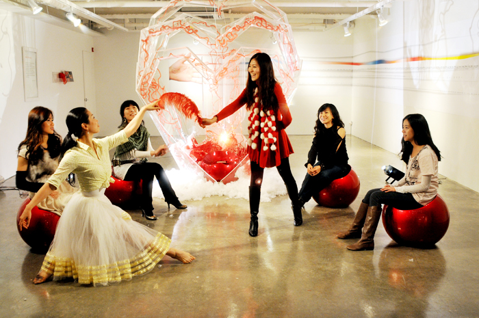 "네, 그럼 각 시기별로 저의 라이프 스토리를 들려드리면서 윰의 삶의 변천사와 레드디멘션의 세계관 변화 이야기들을 들려드리고 싶습니다. 먼저 20대 때 퍼포먼스 아티스트로서 작품 활동을 시작했던 저는 세상 한가운데서 당당히 두 팔을 뻗고 서서 주목받는 저의 모습이 ‘윰’이라는 글자 속에 보였었고 정말 글자 속에 담긴 모습 그대로 세상의 큰 주목을 받으면서 활동했었습니다. 처음 작가로 데뷔했을 때 저는 ‘레드디멘션’이라는 저의 세계관이 담긴 <빨간블라우스>(1995)라는 소설을 쓰고 제가 만든 조각품을 입고 살아있는 조각이 되는 퍼포먼스 아티스트로서 개인전을 개최하고 작품활동을 하게 되었는데요. 왼편은 빨간블라우스 아트북, 가운데는 투명한 빨간 아크릴로 만든 의상 조각품, 오른쪽은 의상조각을 착용하고 ‘살아있는 조각’이 되어 빨간블라우스의 레드디멘션이라는 세계관 안에서 주인공이 되어 퍼포먼스를 하고 있는 저의 모습입니다.