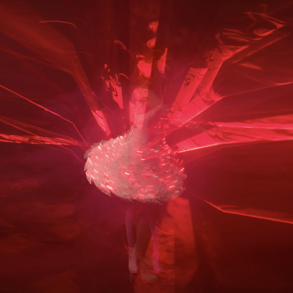 다음 작품은 아티스트가 의상 조각에서 뿜어져 나오는 붉은 레이저에 맞춰 하프의 현을 연주한 영상작품입니다. 마치 레드디멘션의 붉은 우주 한가운데서 빛을 터치했을 때 울려퍼지는 소리의 느낌을 상상하며 메타버스 가상악기 소리를 디자인했고, 아티스트의 동작에 맞춰 비주얼 사운드 퍼포먼스로 표현하였습니다.