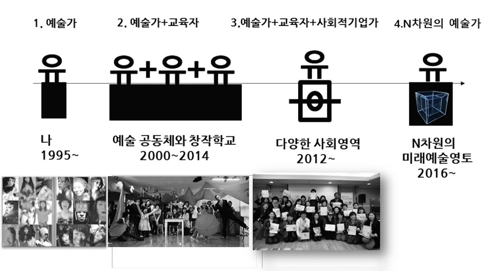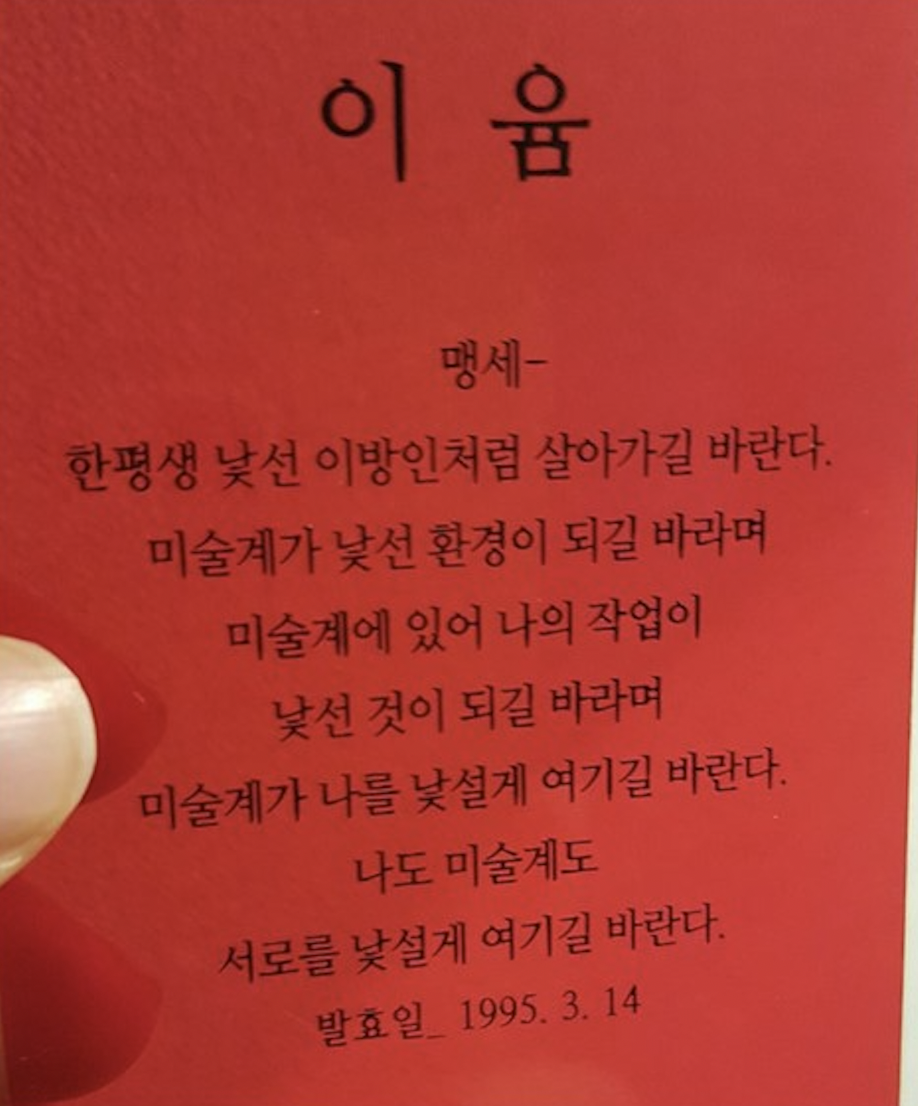 그때 저는 이 이름을 투명한 빨간 아크릴 명함에 쓰고 제 이름에 대한 저의 맹세문을 쓴 후 사람들에게 나눠주며 저의 증인이 되어달라고 요청하는 'Be My Witness' 라는 퍼포먼스를 하며 세상에 저를 알리기 시작했습니다. 정말 제가 이 이름에 쓴 대로 평생 살아가는지 지켜봐 달라는 의미였습니다. 저는 그 맹세문에 평생 한 곳에 정착하는 정착민의 삶이 아닌 부단히 정진하는 이방인의 삶을 살겠다고 다짐하며 그 예술가의 초심이 영원히 변치 않길 바라는 마음이었는데, 저는 정말 제 삶을 예언한 것처럼 그대로 살게 되었습니다. 그래서 저의 이름인 ‘윰’이라는 글자에는 저의 세계관이 모두 담겨 있다고 볼 수 있을 것 같네요. 타임라인으로 표현해보니 아래와 같았습니다.