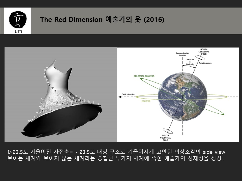 가령, 이 의상에 촘촘히 박혀 있는 크리스털 큐빅은 은하계의 별들을 상징하며, Top View 디자인은 나선 은하계 형태와 예술가 내면의 우주가 상상력의 파장을 일으키며 팽창하는 형태를 표현하고 있습니다. 지구의 자전축과 -23.5도 거울 대칭 구조로 기울어지게 고안된 의상조각의 Side View는 거울 세계처럼 보이지 않지만 존재하는 또 하나의 대칭적 세계를 의미합니다. 의상의 Bottom View는 의상을 입었을 때 보이지 않는 레드디멘션으로 향하는 우주적 통로가 열리고 두 세계가 접속되는 차원 이동 통로의 모습을 하고 있습니다."